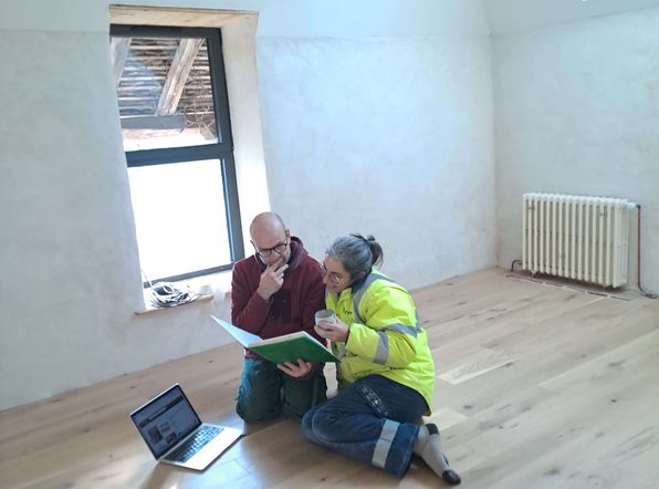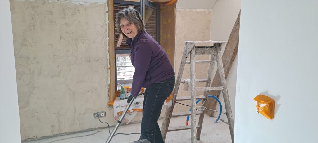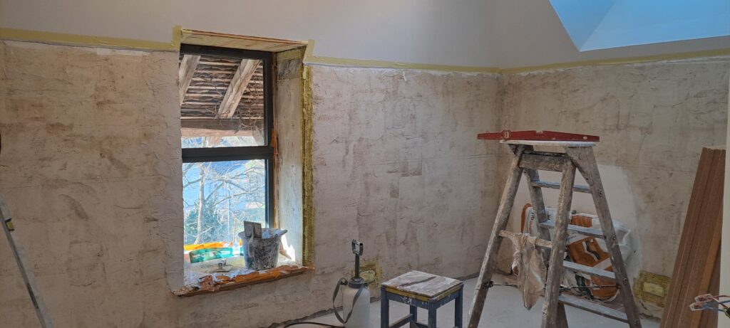 Ces dernières semaines ont (encore une fois) été productives au Maquis ! Travée 1, Damien, Anne-Claire, Margaux et Jonathan ont soufflé la ouate de cellulose pour isoler à combles perdues le plafond du 1er étage. Damien a ensuite posé une dalle OSB par dessus les caissons pour constituer ce qui pourra être une base pour un grenier propre… ou pour le plancher d’un hypothétique 2e étage. Au 1er étage, la peinture à l’argile a été passée sur 90 % des murs (merci Maïté, Margaux et Patricia d’avoir prêté main forte à Anne-Claire !)et l’enduit de finition (chaud aérienne – sable fin) aura bientôt été passé sur tous les murs du 1er étage (grâce à Anne-Claire et Maïté). Travée 2, le projet de mur chauffant (avec l’eau de la cuisinière-poêle-bouilleur) est lancé ! Plus de détails dans la prochaine newsletter ! En parallèle, Sylvain a fini d’enlever la mousse et de remplacer les tuiles cassées côté ouest du toit.