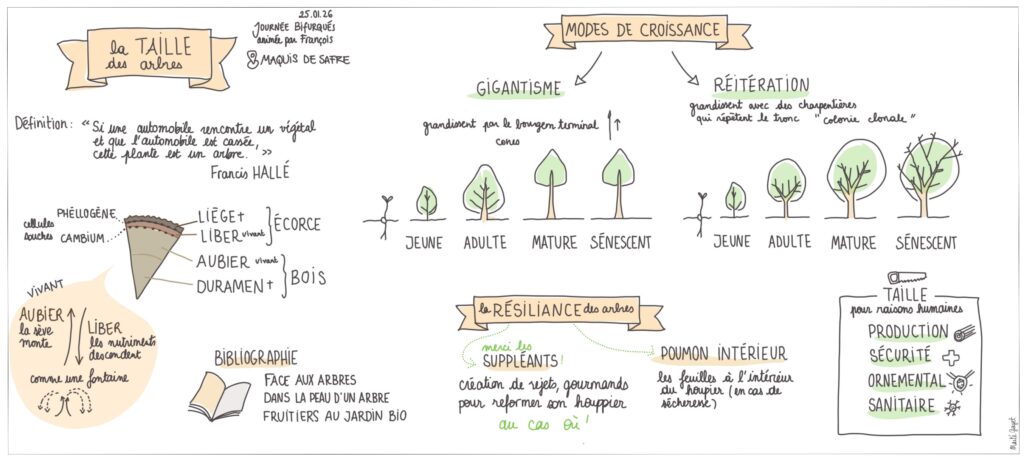 Le 15 février, nous avons accueilli une formation sur la taille des arbres, en collaboration avec l’association Les Bifurqués, et animée par François Bador de la pépinière Le chant des arbres à Le Fay (71), avec le soutien de Thomas Delespierre, élagueur à Mouthier-en-Bresse, tous deux membres des Bifurqués. Une vingtaine de personnes ont pu profiter de cette formation, avec des apports théoriques en matinée et une partie pratique en après-midi. Les personnes présentes ont pu s’exercer à la taille de formation et de fructification mais également à la taille à des fins sanitaires. L’aspect sécurité a également été abordé. Une belle journée riche en apprentissages et échanges !