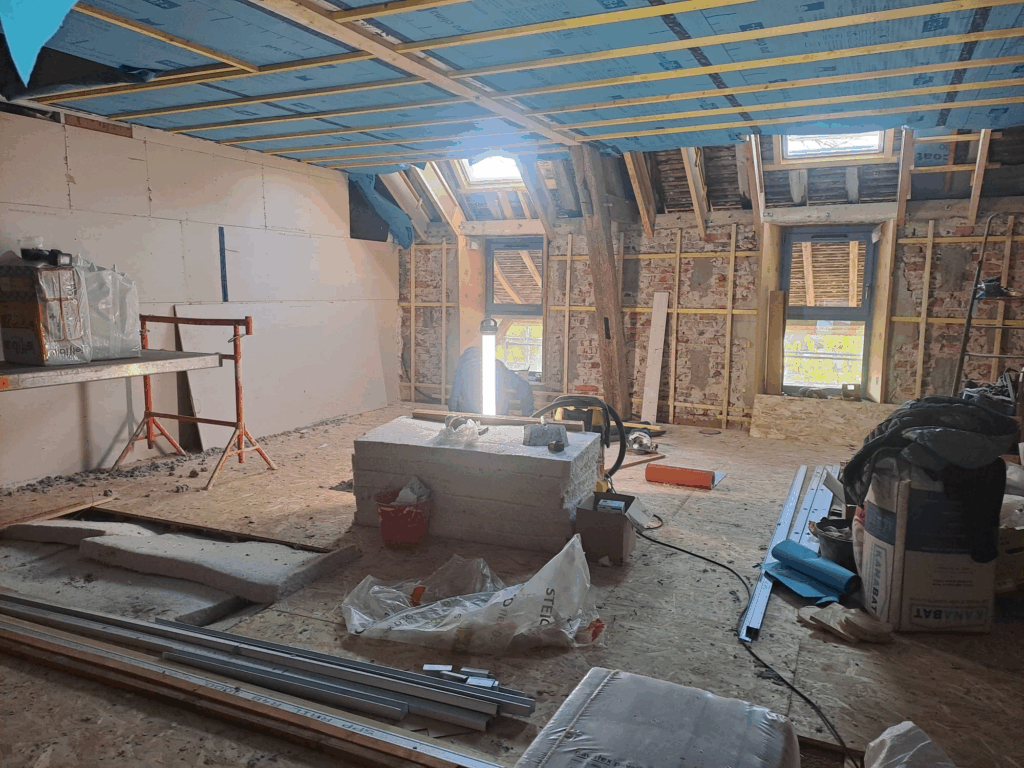 Chez Anne-Claire et Damien, les cloisons intérieures de l’étage ont été montées par Damien, les velux posés par Sylvain (avec l’aide de Martin), l’escalier par Éric et le lambris du plafond par Joram, Emmanuel et Damien. Chez Maïté et Sylvain, les travaux ont débuté à l’étage avec la fixation du frein vapeur par Maïté, Martin et Camille et la pose — de niveau et par Sylvain — du plancher OSB qui recevra l’isolation puis le parquet contre-collé.