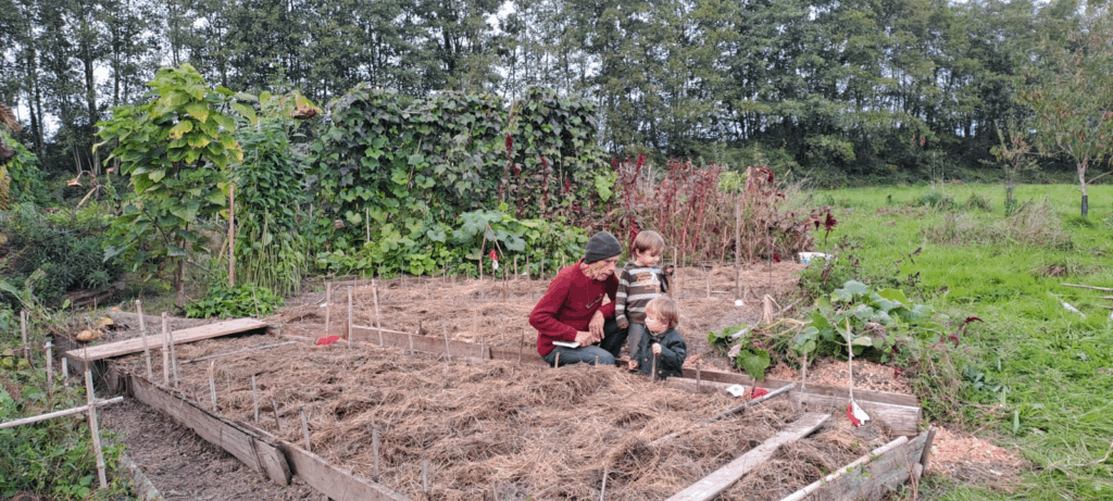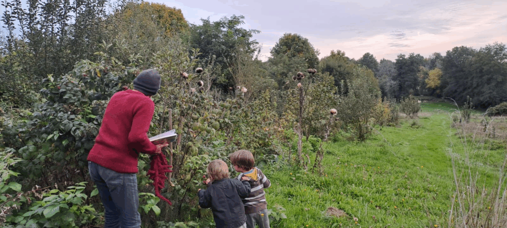 Cette année, grâce aux efforts de Jean-Louis et Éliane (et l’aide ponctuelle quelque peu intéressée d’Orion et Noé), nous avons récolté tomates, concombres, haricots verts, oignons, potimarrons…. Nous avons ainsi pu stériliser une bonne centaine de bocaux de sauce tomate et de ratatouille. Côté fruits, outre les mûres toujours aussi nombreuses, nous avons récolté des pêches, des framboises, des fraises, des pommes, des prunes, des figues, du raisin et quelques poires que nous avons transformés en fruits au sirop, compotes, confitures et autre kozos (ou cru-fiture). Actuellement, nous ramassons noix et châtaignes, tandis que les kakis mûrissent tranquillement. Et d’ici quelques jours, nous ramasserons nos premières amandes (pour une dégustation, on attendra quelques années, car il n’y en a que 5 sur l’arbre !).