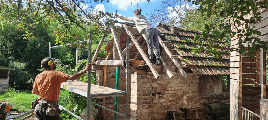 Début septembre, nous avons eu le plaisir d’avoir la visite de Camille et Martin, des amis de Maïté. Respectivement architecte et charpentier, ils ont pu, lors de leur séjour, nous faire profiter de leurs compétences notamment en reprenant une partie de la charpente du four à pain qui était bien mal en point. Et pour fêter cette réparation, nous avons fait une soirée pizzas ainsi qu’une énorme fournée de pain qui nous a régalés pendant une bonne dizaine de jours !